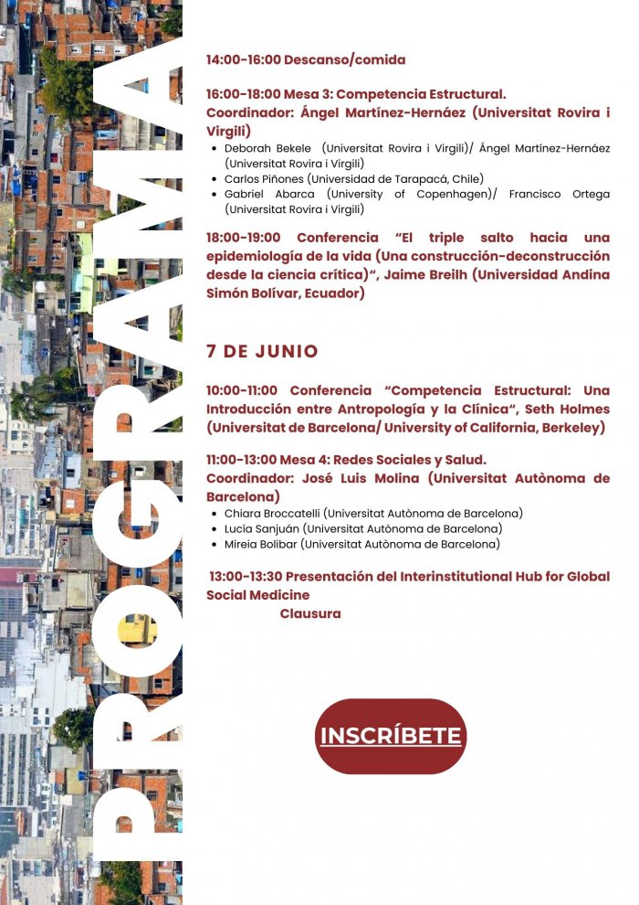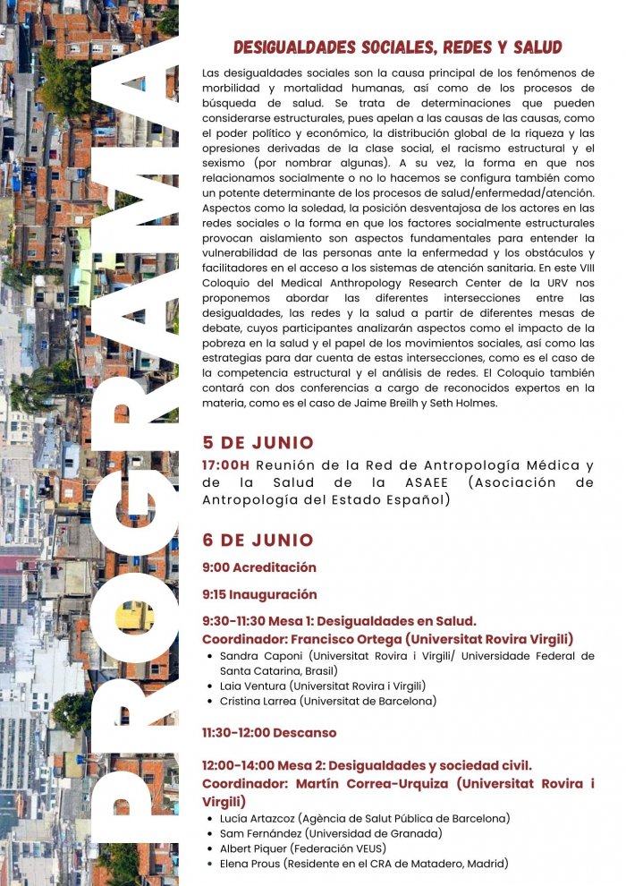 L´esdeveniment comptarà amb la participació de professors/es i investigadors/es de diferents universitats que abordaran i analitzaran en quatre taules de debat temàtiques l´impacte de la pobresa i les desigualtats socials en salut, el paper dels moviments socials, així com les estratègies per donar compte daquestes interseccions, com és el cas de la competència estructural i lanàlisi de xarxes. També hi haurà dues conferències a càrrec de reconeguts experts en la matèria, com és el cas de Jaime Breilh i Seth Holmes.