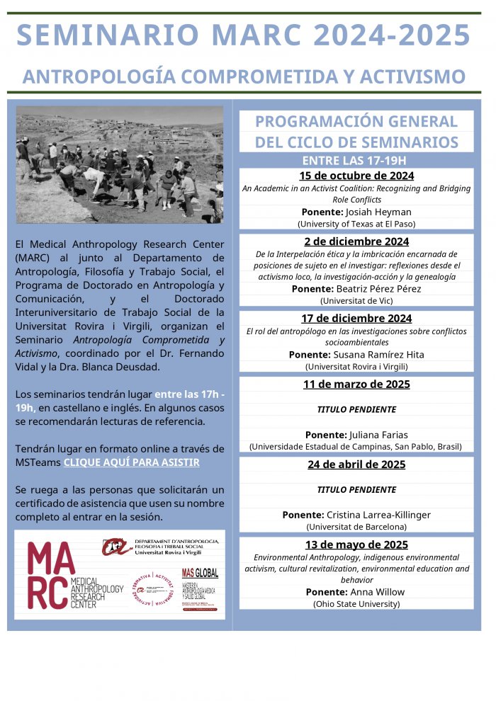 El Medical Anthropology Research Center (MARC) juntament amb el Departament d'Antropologia, Filosofia i Treball Social, el Programa de Doctorat en Antropologia i Comunicació, i el Doctorat Interuniversitari de Treball Social de la Universitat Rovira i Virgili, organitzen el Seminari Antropologia Compromès i Activisme , coordinat pel Dr. Fernando Vidal i la Dra. Blanca Deusdad.