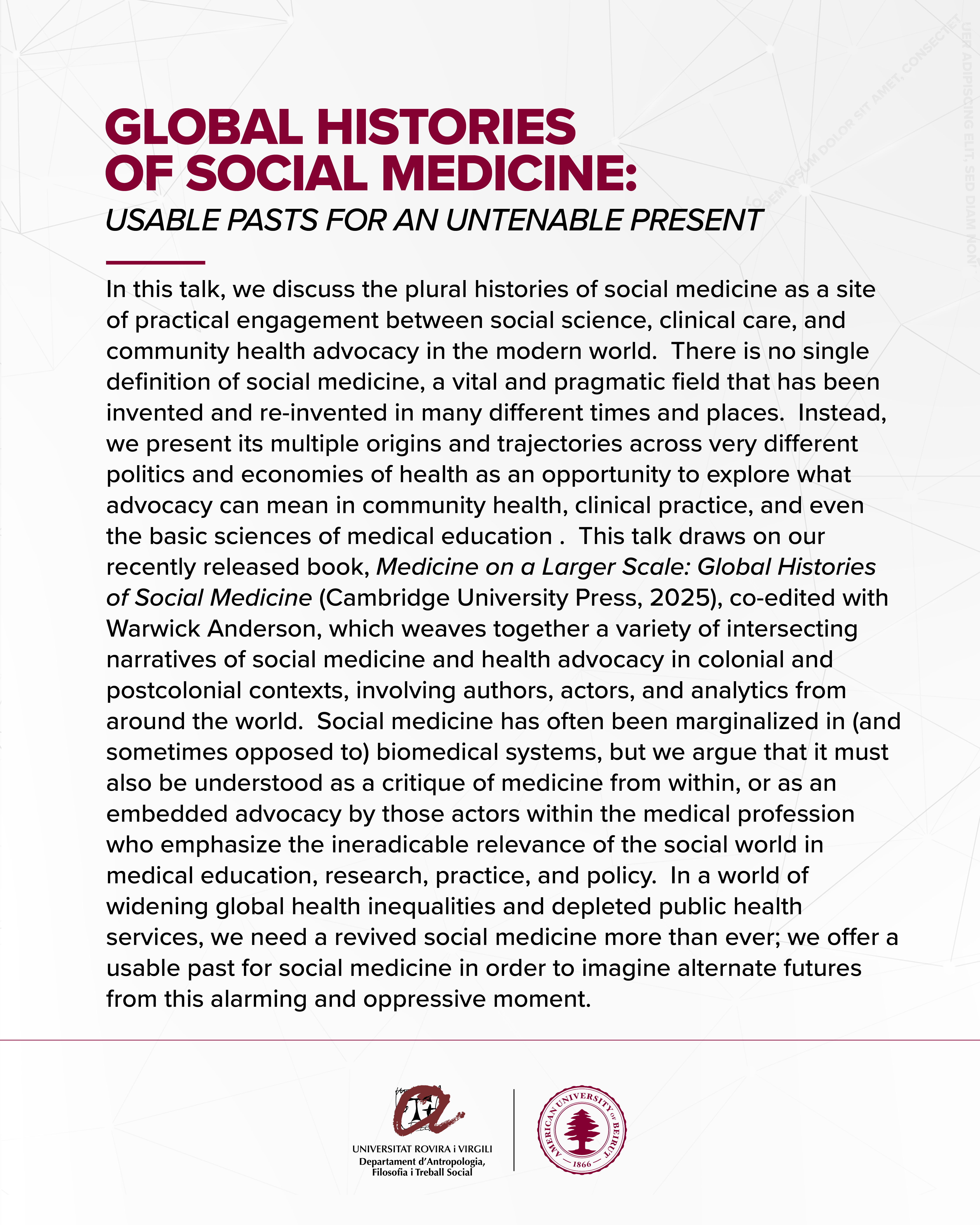 In this talk, we discuss the plural histories of social medicine as a site of practical engagement between social science, clinical care, and community health advocacy in the modern world. There is no single definition of social medicine, a vital and pragmatic field that has been invented and re-invented in many different times and places. Instead, we present its multiple origins and trajectories across very different politics and economies of health as an opportunity to explore what advocacy can mean in community health, clinical practice, and even the basic sciences of medical education. This talk draws on our recently released book, Medicine on a Larger Scale: Global Histories of Social Medicine (Cambridge University Press, 2025), co-edited with Warwick Anderson, which weaves together a variety of intersecting narratives of social medicine and health advocacy in colonial and postcolonial contexts, involving authors, actors, and analytics from around the world. Social medicine has often been marginalized in (and sometimes opposed to) biomedical systems, but we argue that it must also be understood as a critique of medicine from within, or as an embedded advocacy by those actors within the medical profession who emphasize the ineradicable relevance of the social world in medical education, research, practice, and policy. In a world of widening global health inequalities and depleted public health services, we need a revived social medicine more than ever; we offer a usable past for social medicine in order to imagine alternate futures from this alarming and oppressive moment.