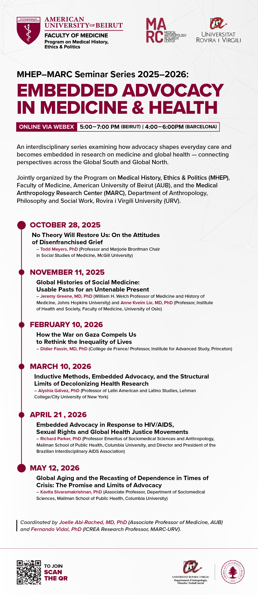 Jointly organized by the Program on Medical History, Ethics & Politics (MHEP), Faculty of Medicine, American University of Beirut (AUB), and the Medical Anthropology Research Center (MARC), Department of Anthropology, Philosophy and Social Work, Rovira i Virgili University (URV).