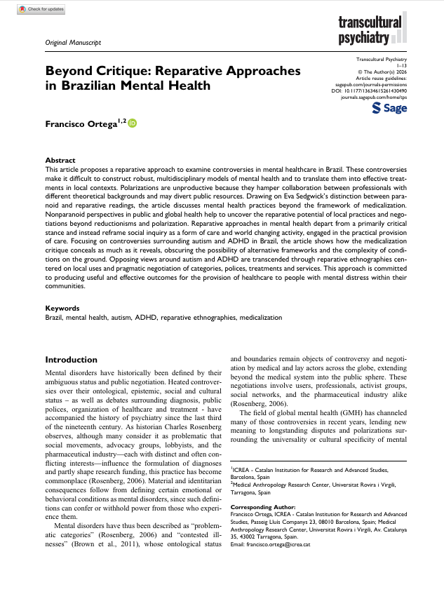 New article by Francisco Ortega, published by Transcultural Psychiatry: "Beyond Critique: Reparative Approaches in Brazilian Mental Health".