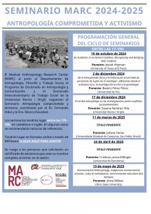 El Medical Anthropology Research Center (MARC) al junto al Departamento de Antropología, Filosofía y Trabajo Social, el Programa de Doctorado en Antropología y Comunicación, y el Doctorado Interuniversitario de Trabajo Social de la Universitat Rovira i Virgili, organizan el Seminario Antropología Comprometido y Activismo, coordinado por el Dr. Fernando Vidal y la Dra. Blanca Deusdad.